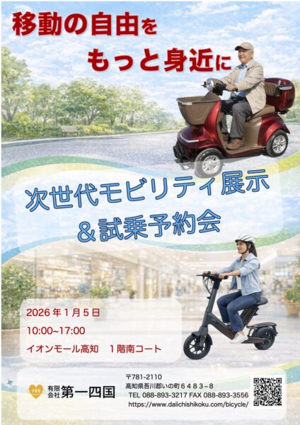 2026年1月5日、イオンモール高知1階南コートにて、特定小型原付の展示会および